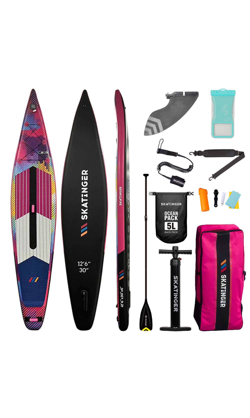 The CMYK inflatable racing paddle board by Skatinger is built for speed, precision, and personality. With a streamlined shape and vibrant graphic style, this board delivers top-tier performance on flatwater or light chop — perfect for advanced paddlers and competitive souls looking to stand out while gliding fast.